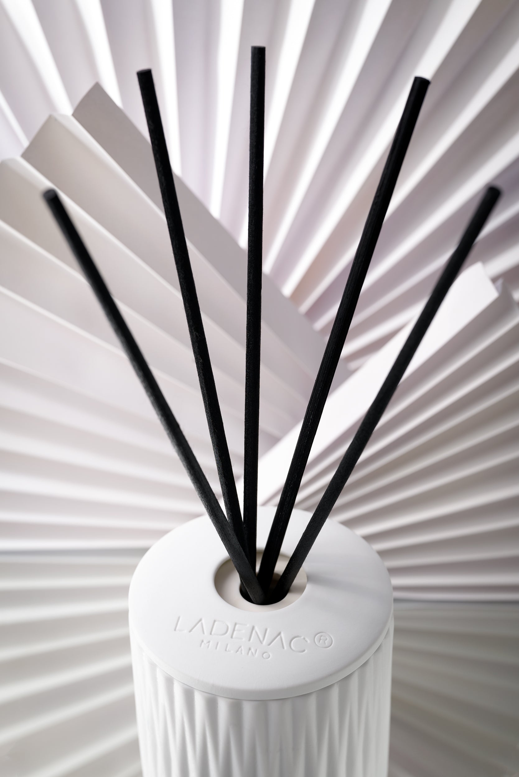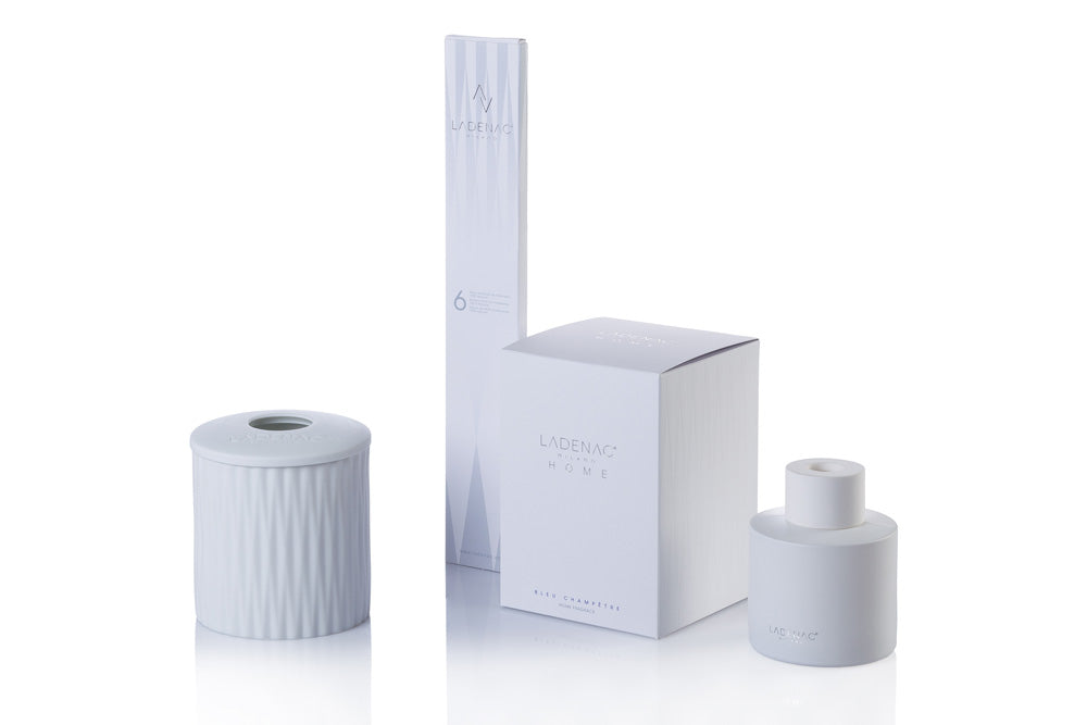 White ceramic stick diffuser decorated with a delicate pattern of simple folds that refer to the art of Origami. Handcrafted production is characterized by drawings and motifs with touches of contemporary style a minimalist and delicate design proposal. Flat design box of a highly absorbent rattan sticks. Candle with fresh and spring scent. 200 ml.
