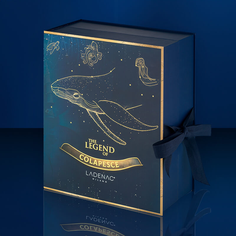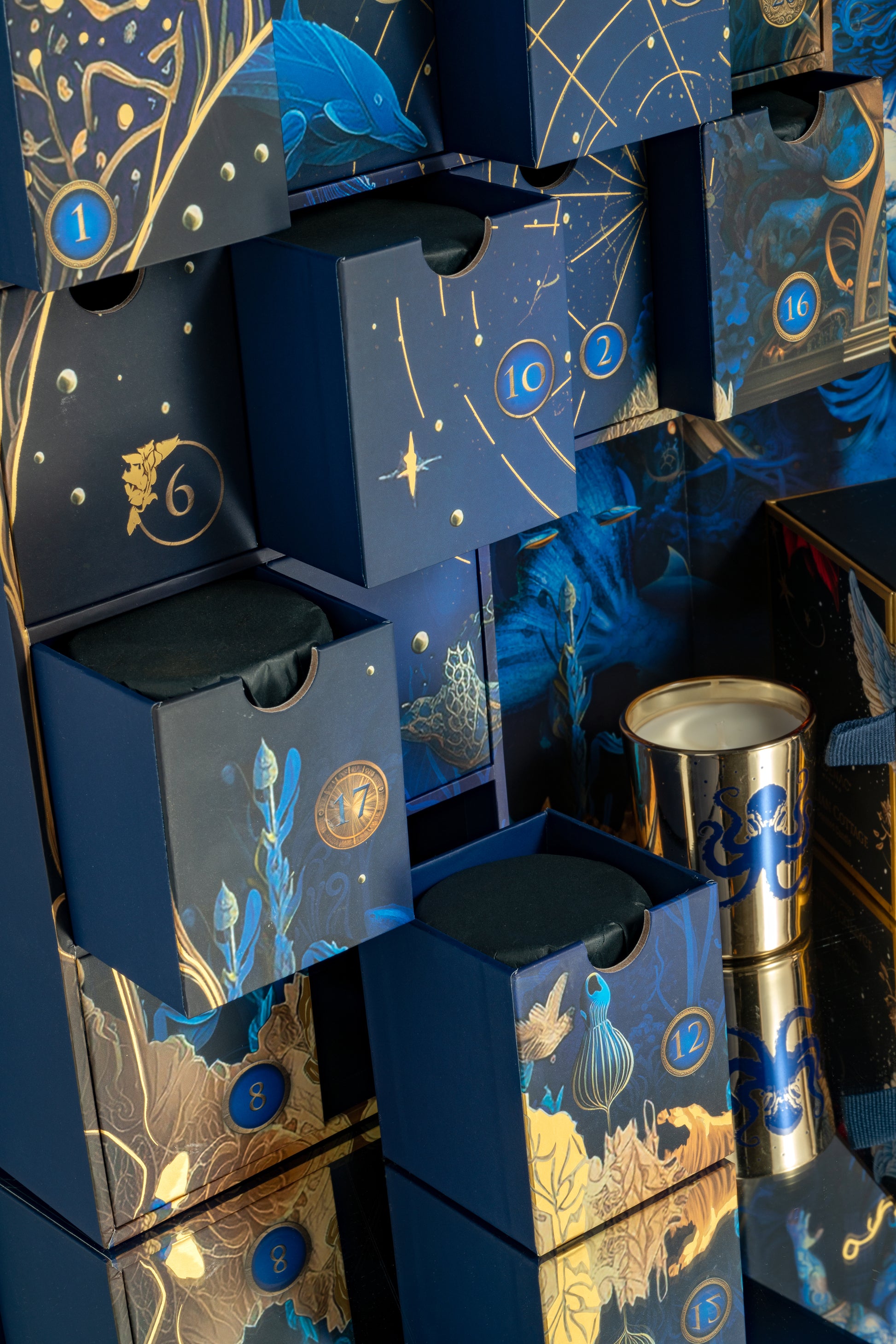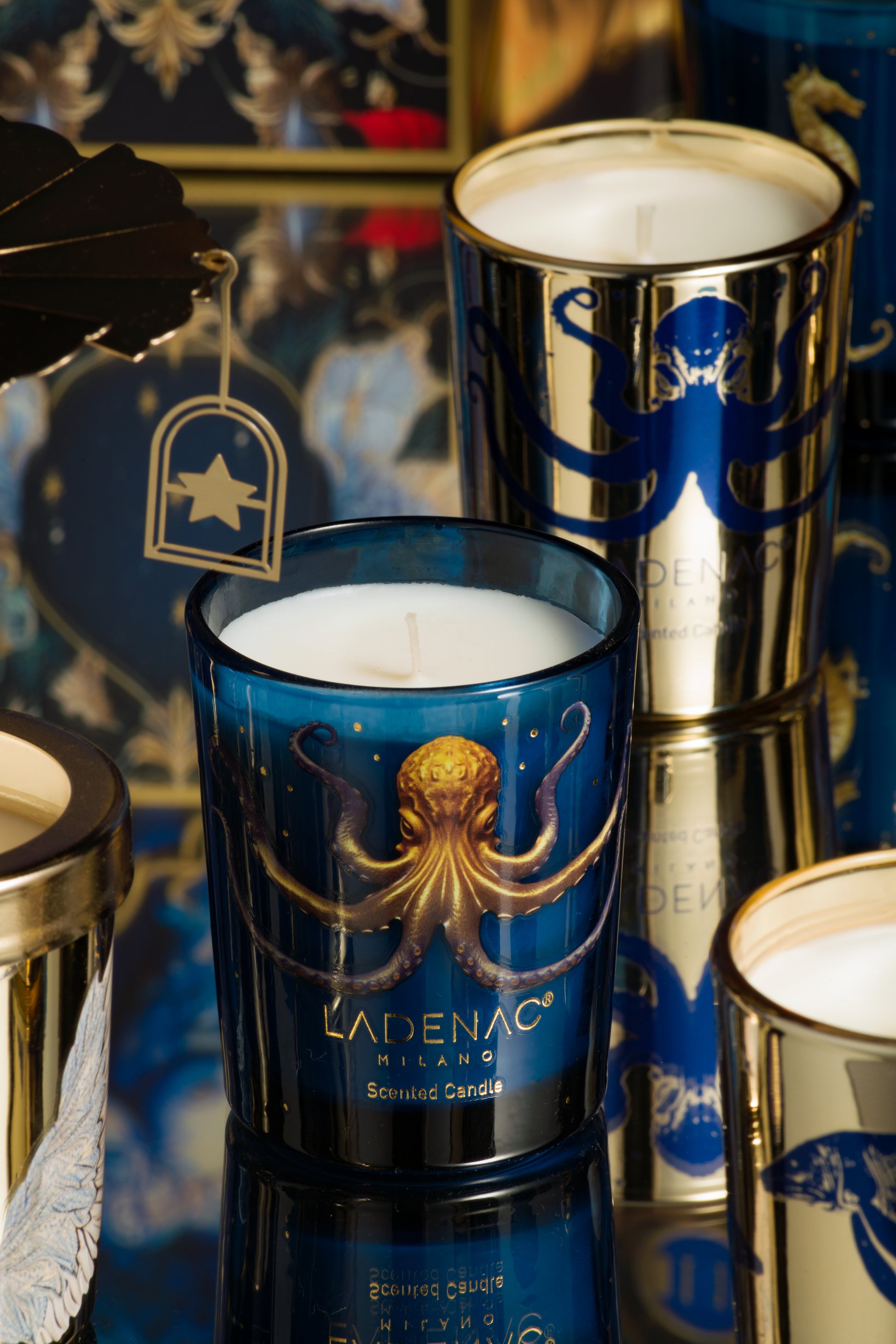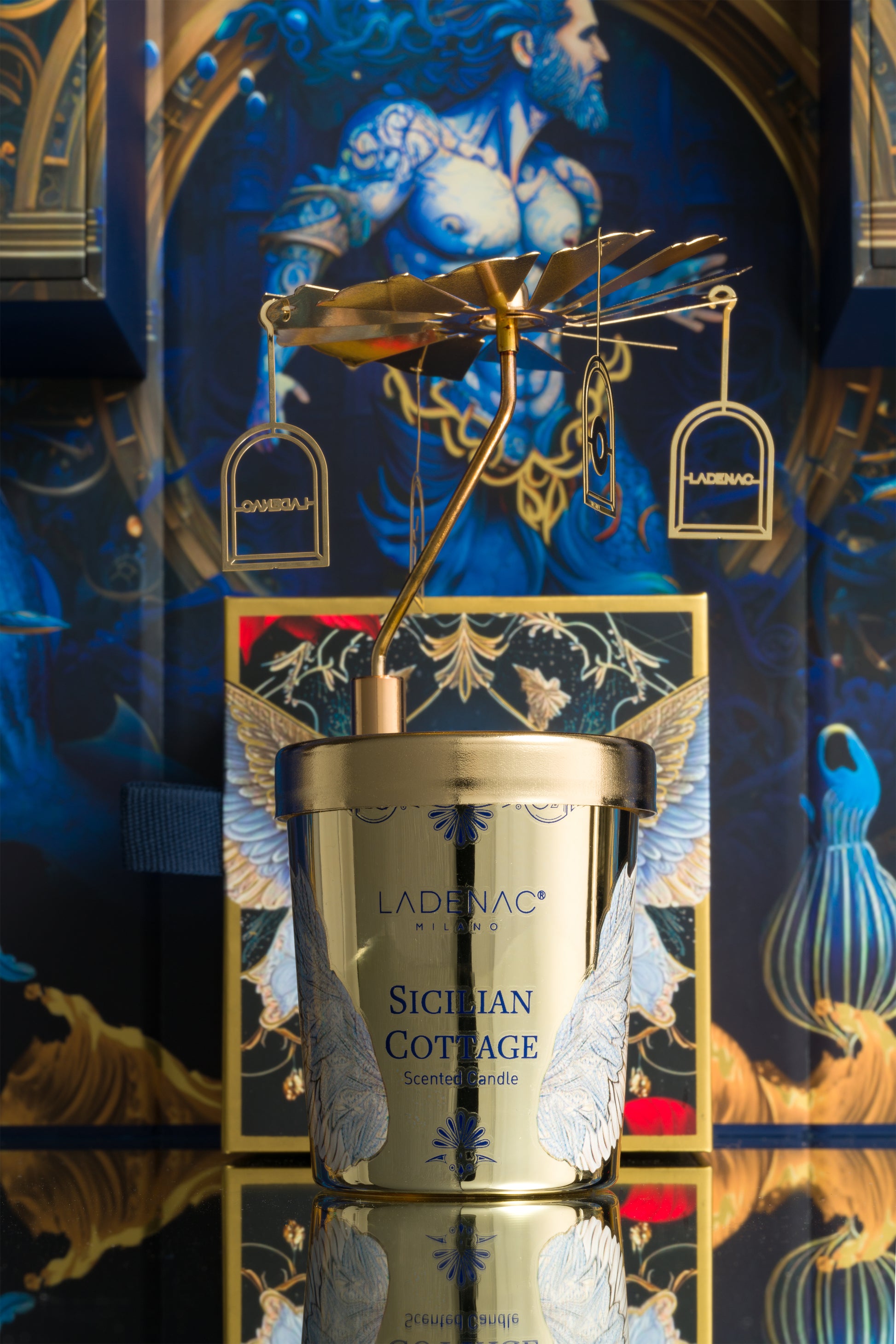 Different species of the underwater world silkscreened on each of the sails and cobalt blue and gold coated in colors that when the wick is lit reflects its light through them, creating a magical atmosphere, a visual spectacle.