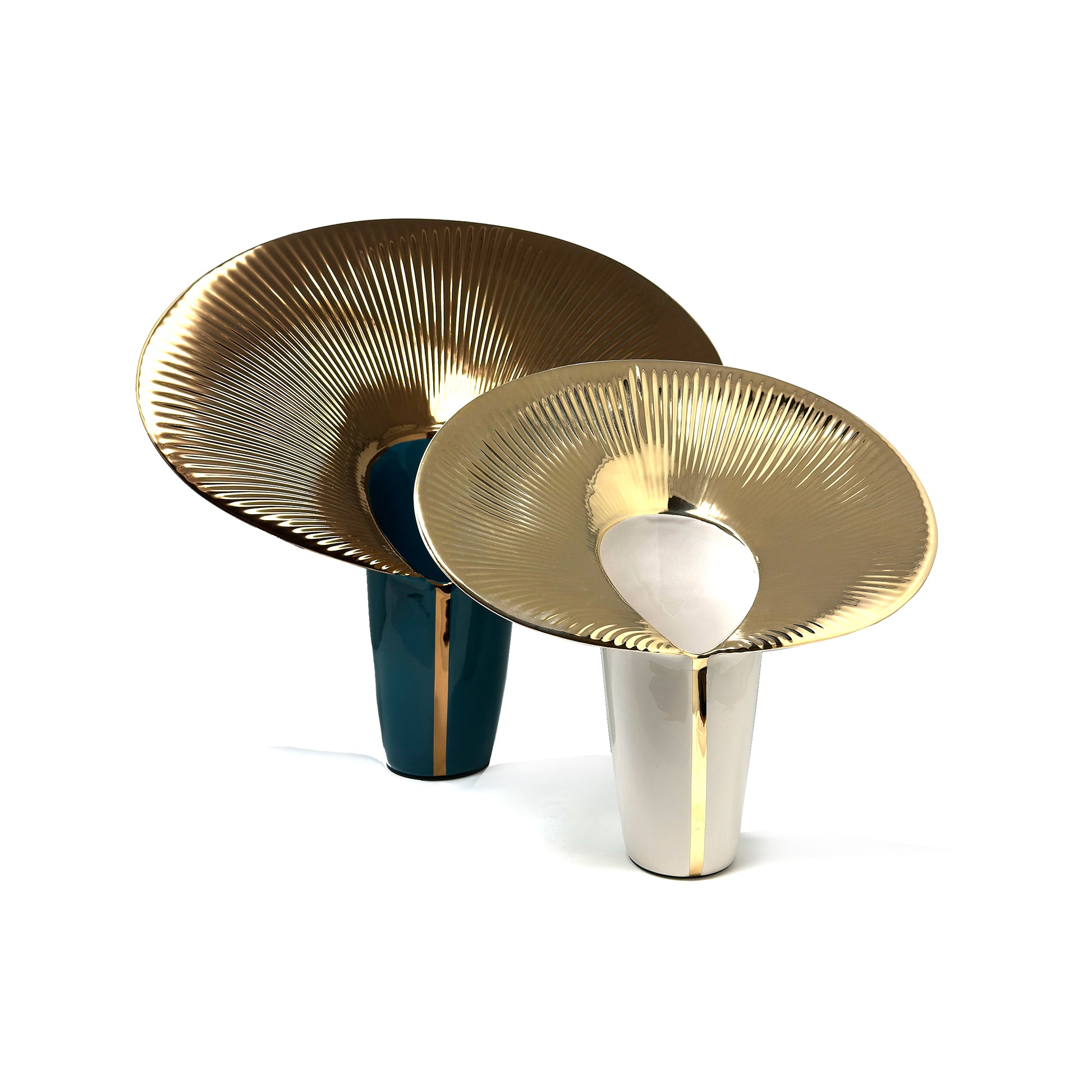 Fusca is a voluptuous vase collection, with organic lines and glorious finishings. The evocative shape and the movement of the collar give free rein to the imagination, from the stage outfit of a diva to a lion's mane or a calla lily flower.