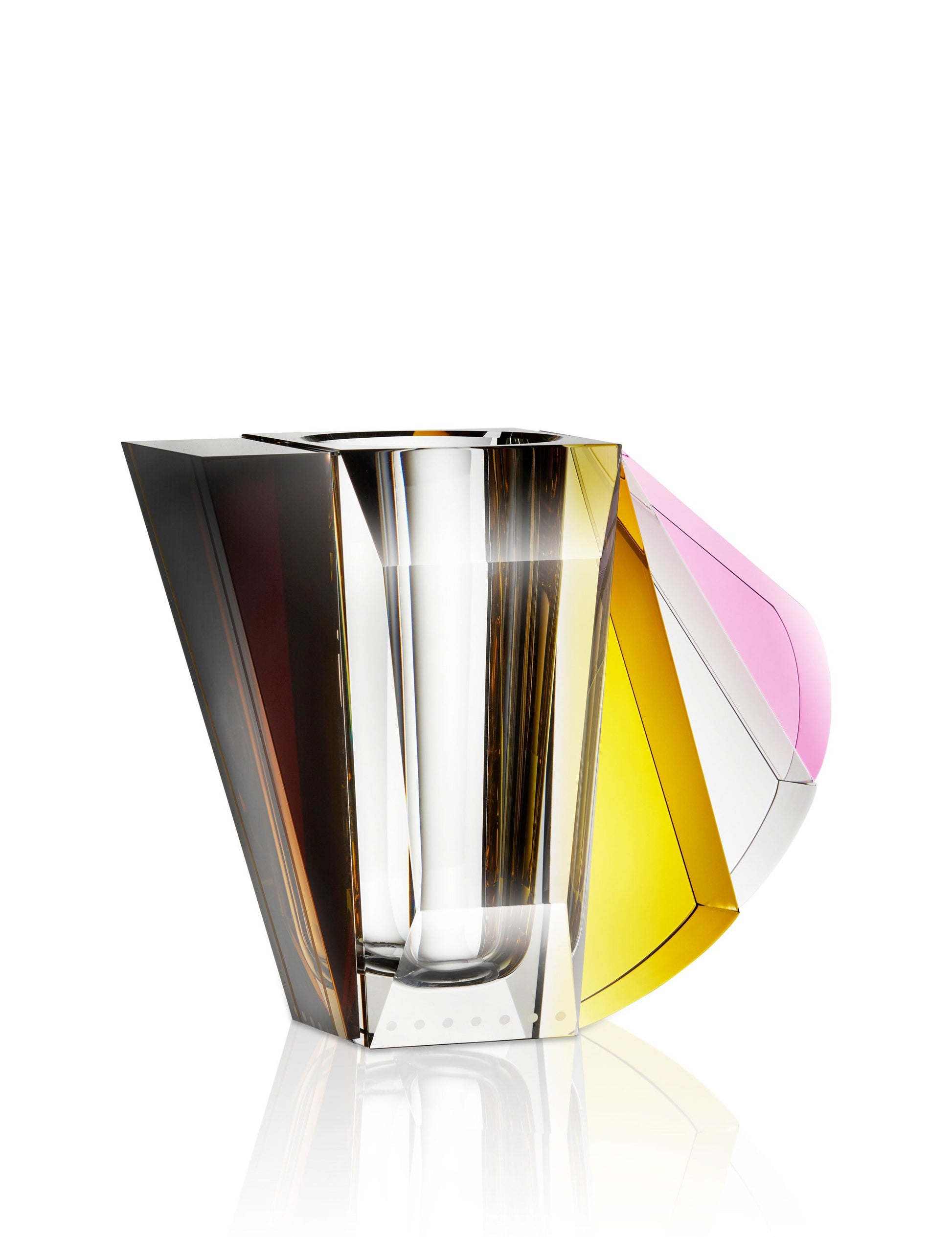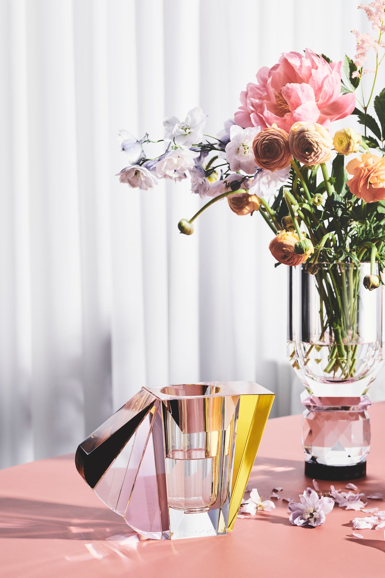 The Manhattan vase is inspired by the architectural lines of the Manhattan skyline and the soft and natural curves of a seashell and incorporated into one. The Manhattan vase is made from hand-cut crystals using unique artisan techniques. This collaboration creates a beautiful game of colourful reflection.