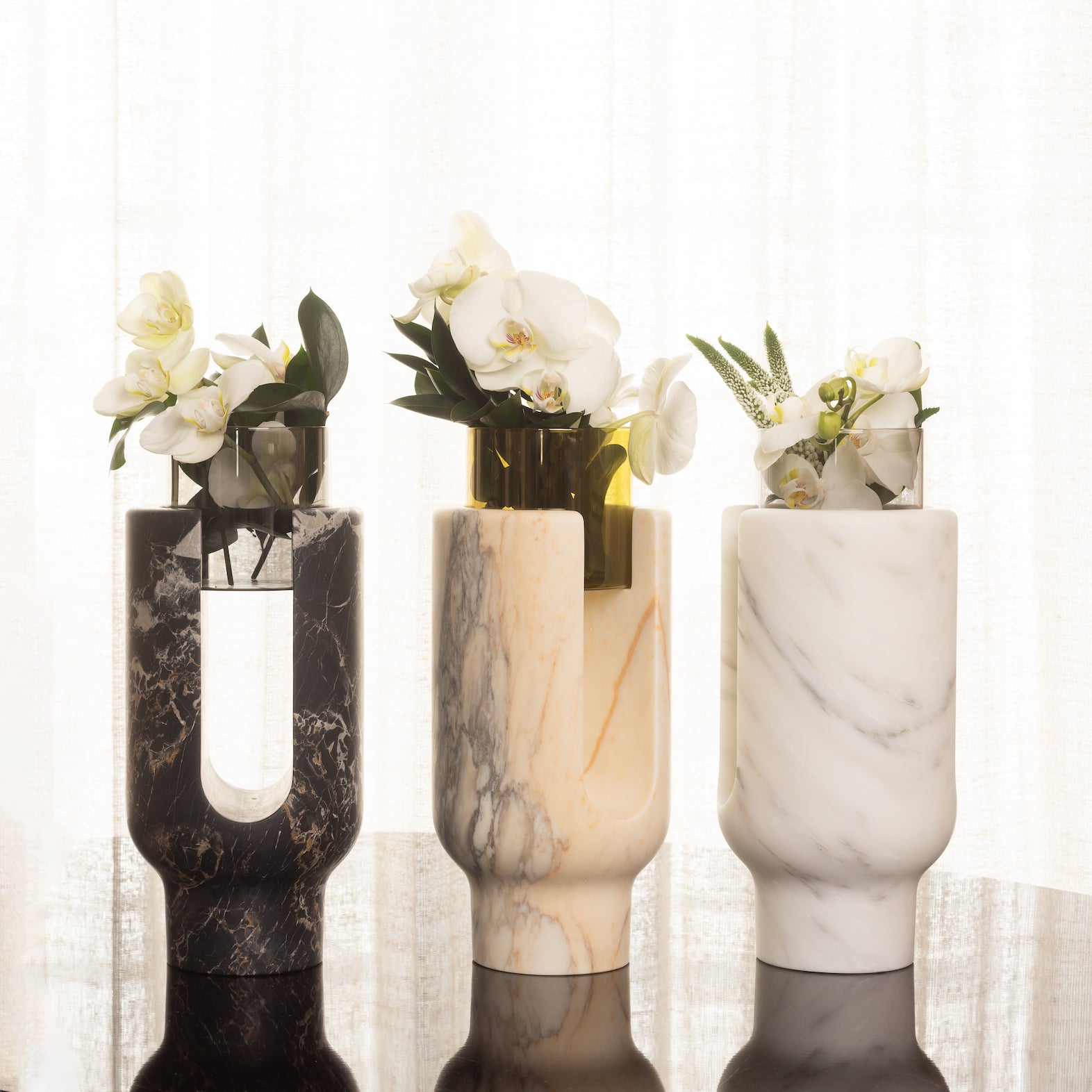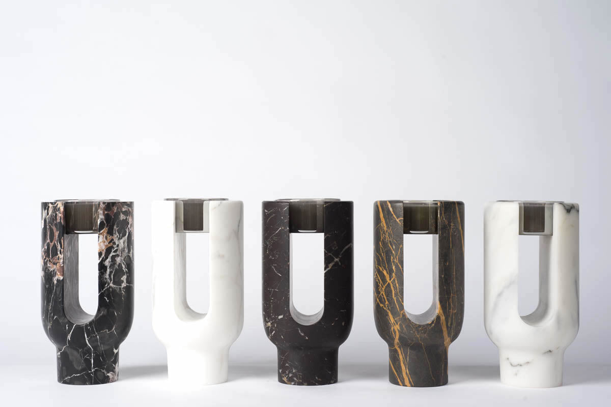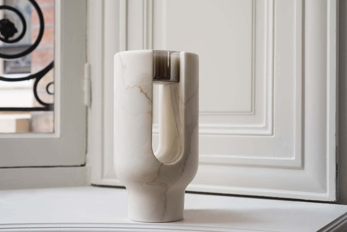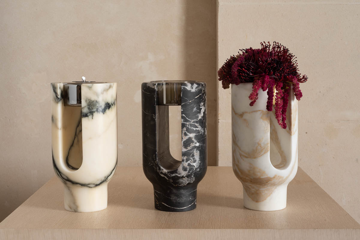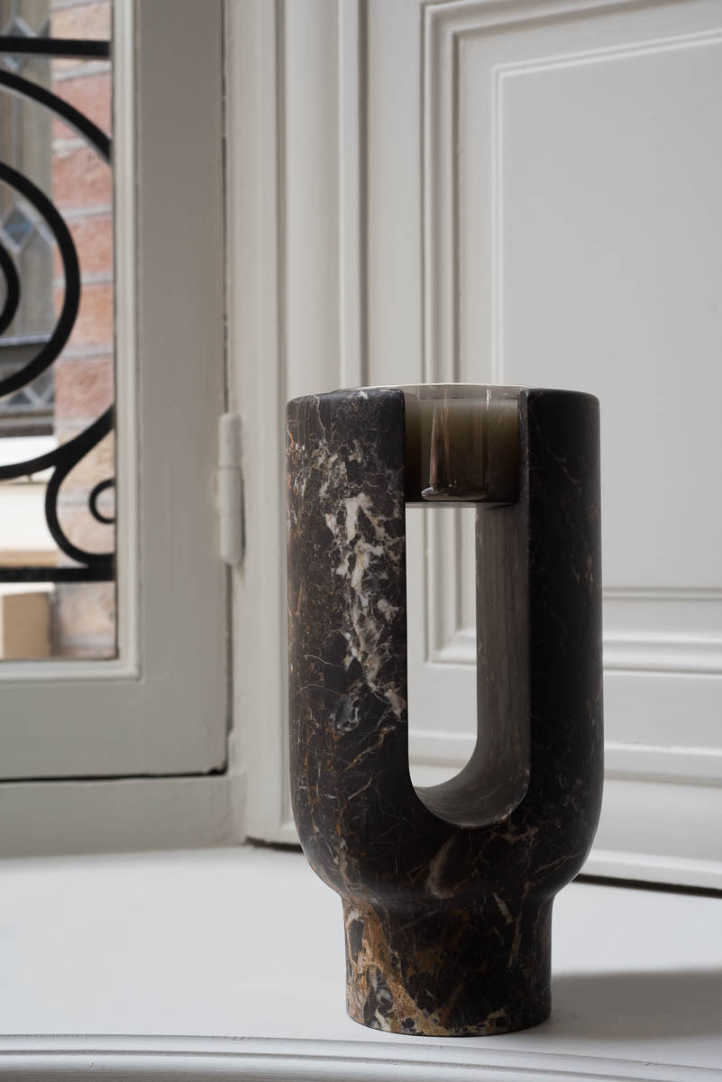Lyra is a torchbearer, a flaming metaphor, an anthem to the material. A marble piece cut in the mass which reveals a varying figure, sometimes oblong, massive, rounded, full or hollowed. The scented capsule nests in the heart of it, just as puzzle pieces would come together. Lyra is a setting as well as an altar of repose where the scented capsule exposes itself like a tightrope walker… Or hides, only revealing its fragrance. A piece for the senses. All the senses.