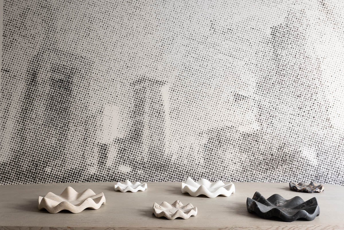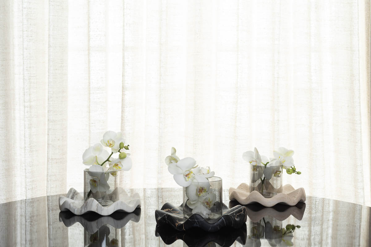 Like a stone flower, Pictor undulates according to the material. From its petals cradled by the randomness emerges a poetry evoking both the painter's palette and a mysterious star. A protean and evanescent object, Pictor lends itself to all interpretations and all scenographies: it will become a candle holder, cup, trinket tray, display... and will of course gracefully accommodate one of our vases.