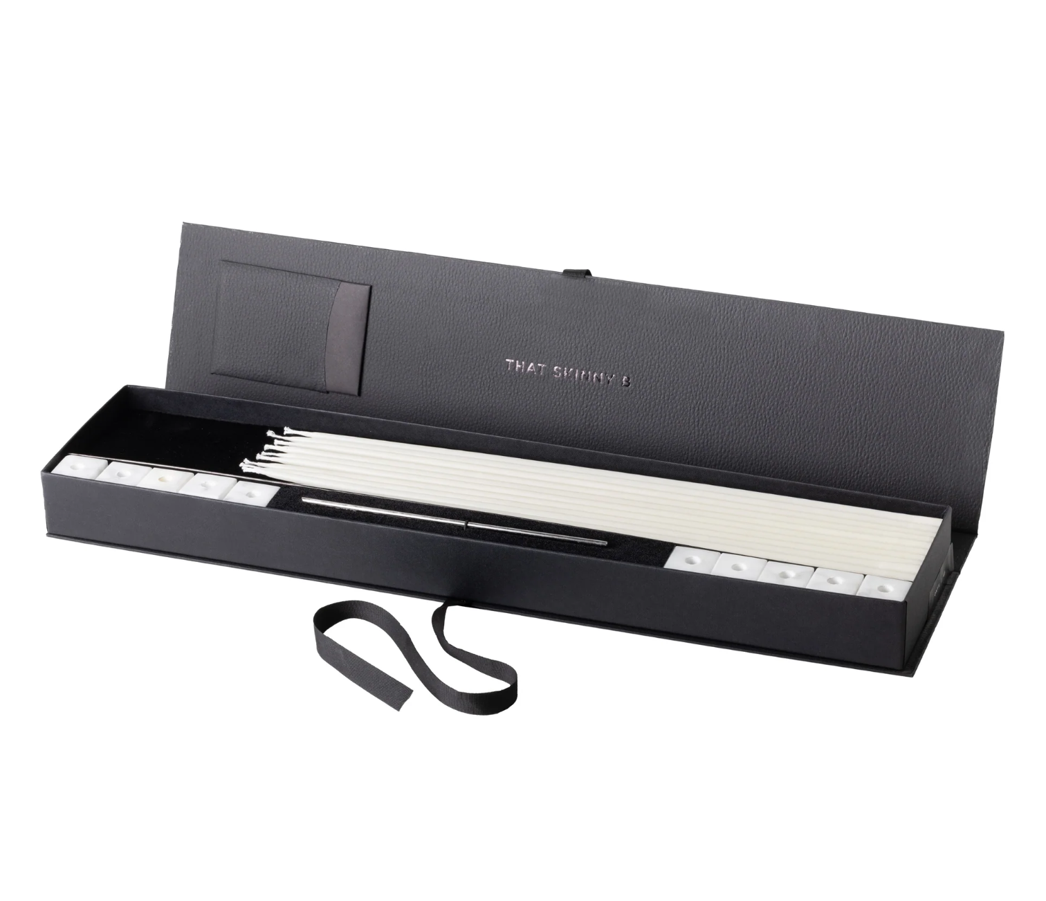 Each Box Set contains 20 candles of equal height and same color, 10 re-usable marble bases and a steel picker to clean the bases, all housed in luxury packaging.