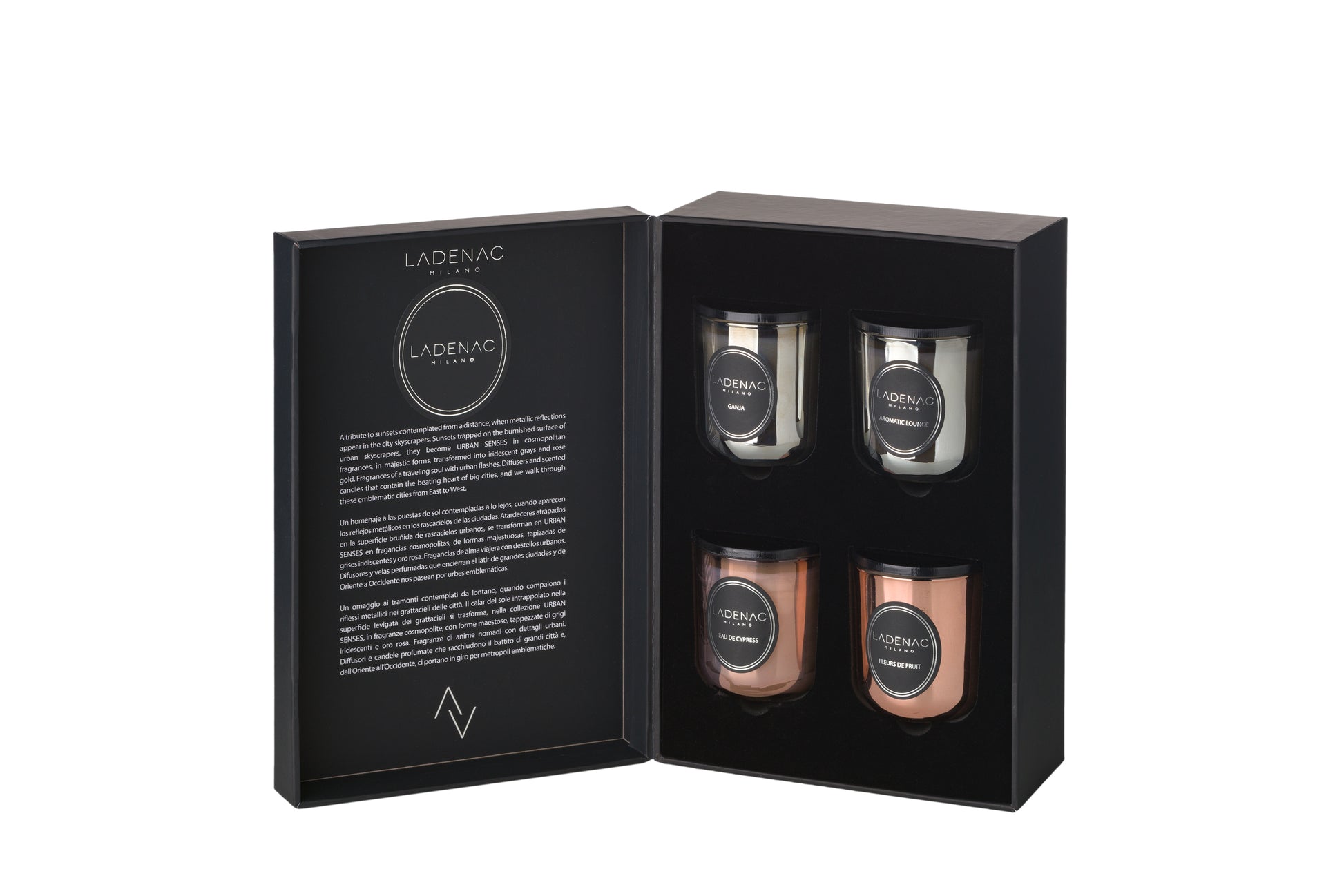 Ladenac is a true globetrotter; and from all the places he travels he brings colors, shapes, sensations and images that feed his inspiration back home. It is no wonder that this collection of scented candles and interior perfumes is inspired by those trips and it is also a tribute to the sunsets seen in the distance, when they appear as metallic reflections in the city skyscrapers. Sunsets trapped on the burnished surface of urban skyscrapers, they become URBAN SENSES in cosmopolitan fragrances, in majestic forms, transformed into iridescent grays and rose gold. Six fragrances of a travelling soul with urban flashes. Diffusers and scented candles that contain the beating heart of big cities, and we walk through these emblematic cities from East to West: Ganja, Fleurs de fruit, Rose de nuit, Aromatic Lounge, Eau de cypress, Boisée chic.